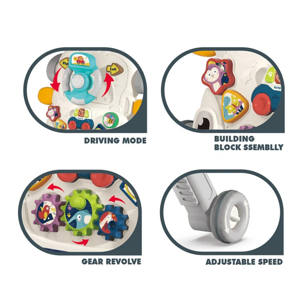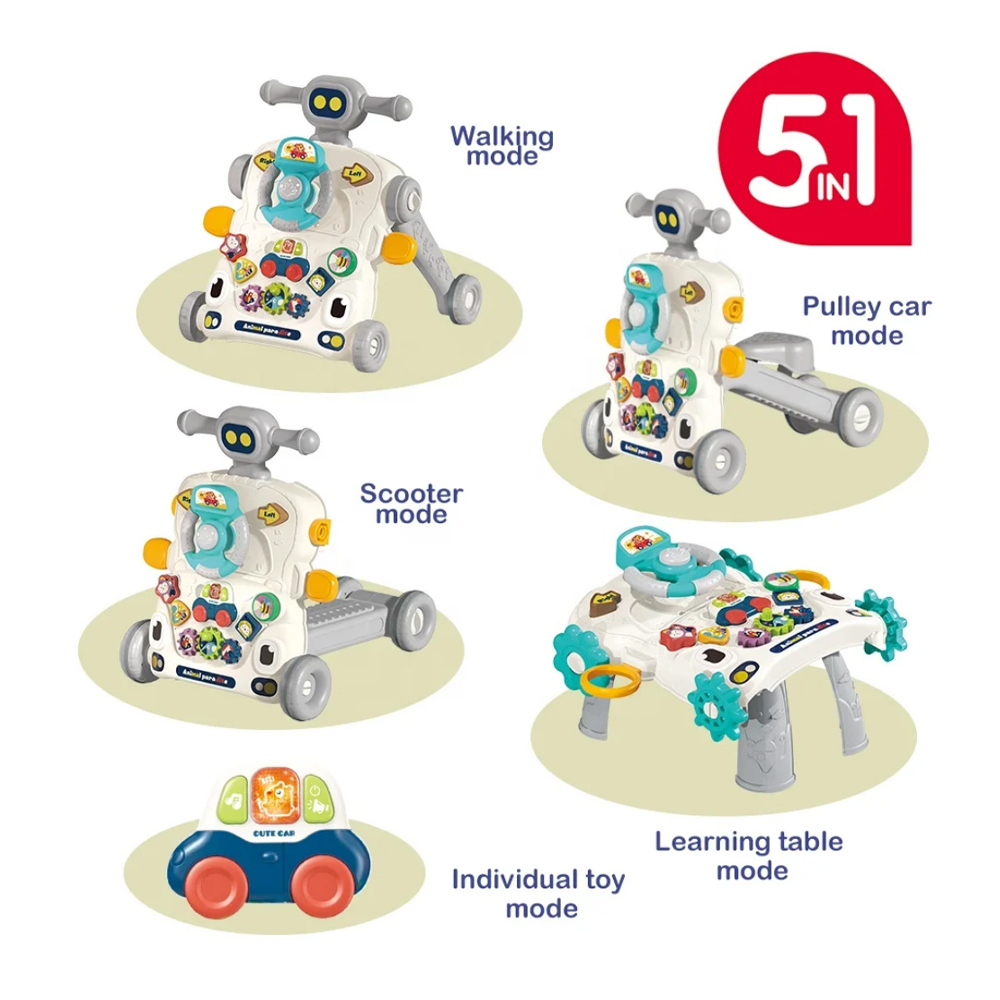 واکر 6 کاره در حالت های مختلفی از جمله اسکوتری، نشیمن دار و حالت میز بازی مورد استفاده قرار میگیرد ( داخل تصاویر سایت نشان داده شده) و شما با خرید این محصول، یک مجموعه ی کامل بازی برای کودکتان تهیه میکنید. این واکر موزیکال و چراغ دار بوده و اسباب بازی های آموزشی طراحی شده روی آن، به تقویت هوش، قدرت شنوایی و تشخیص رنگها کمک میکند.